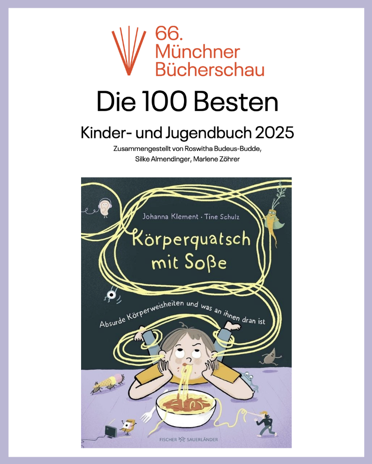 Unser Buch „Körperquatsch mit Soße“ von Tine Schulz und mir gehört zu den „100 BESTEN“ der Münchner Bücherschau. Jetzt darf es gemeinsam mit den anderen tollen Bücher auf Wanderausstellung durch die Schulen ziehen. Richtig schön!